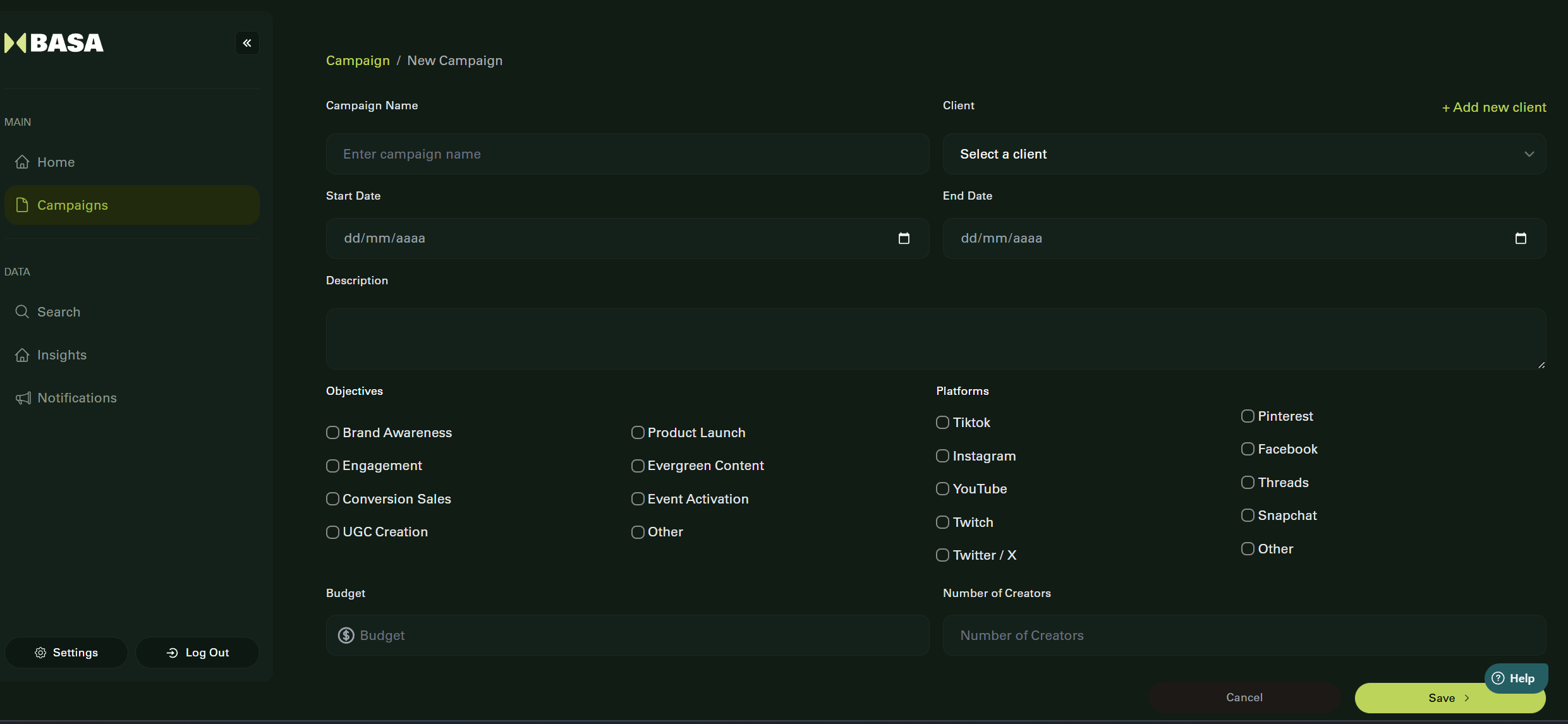 Fill in the campaign form with the following: